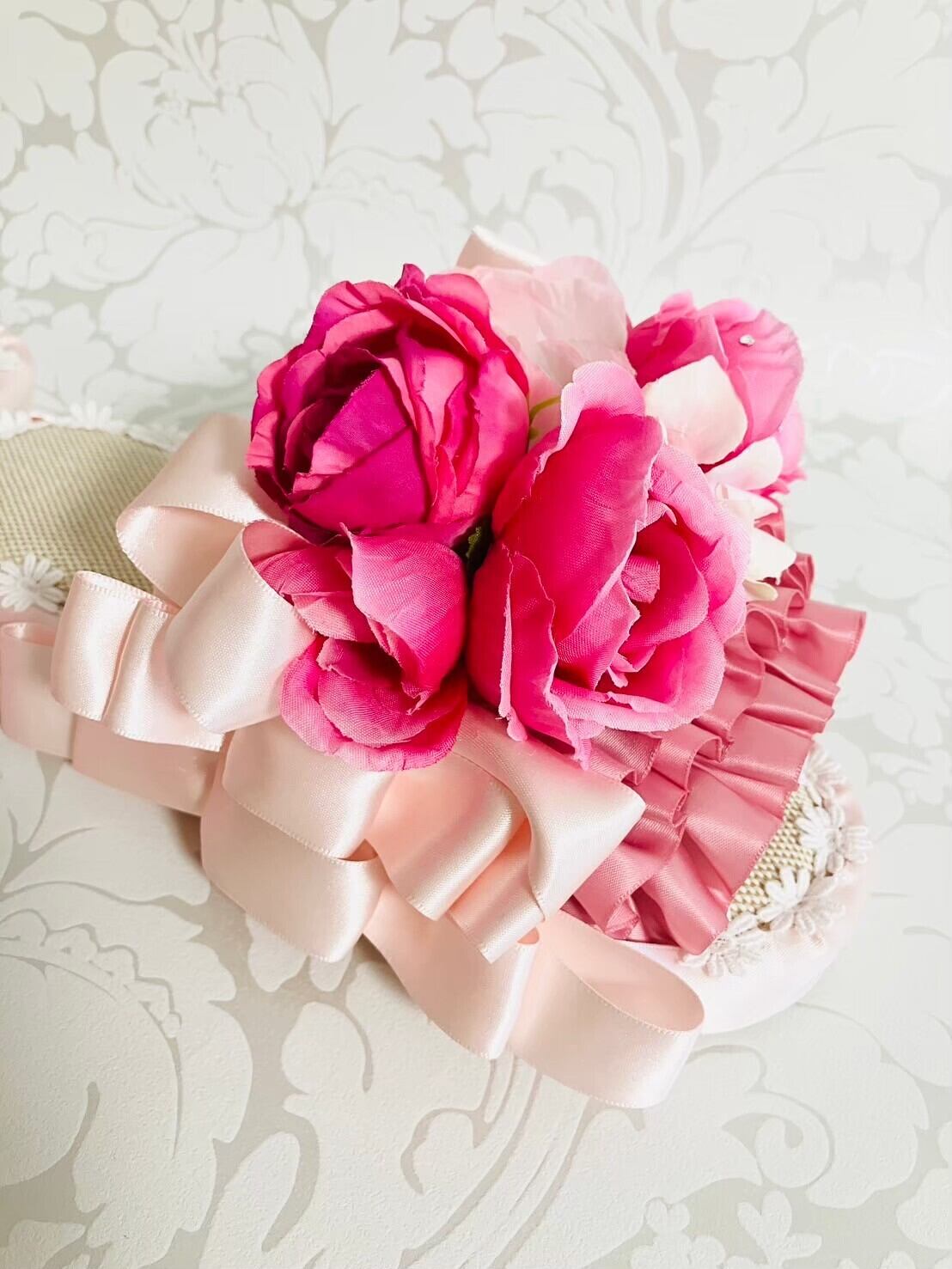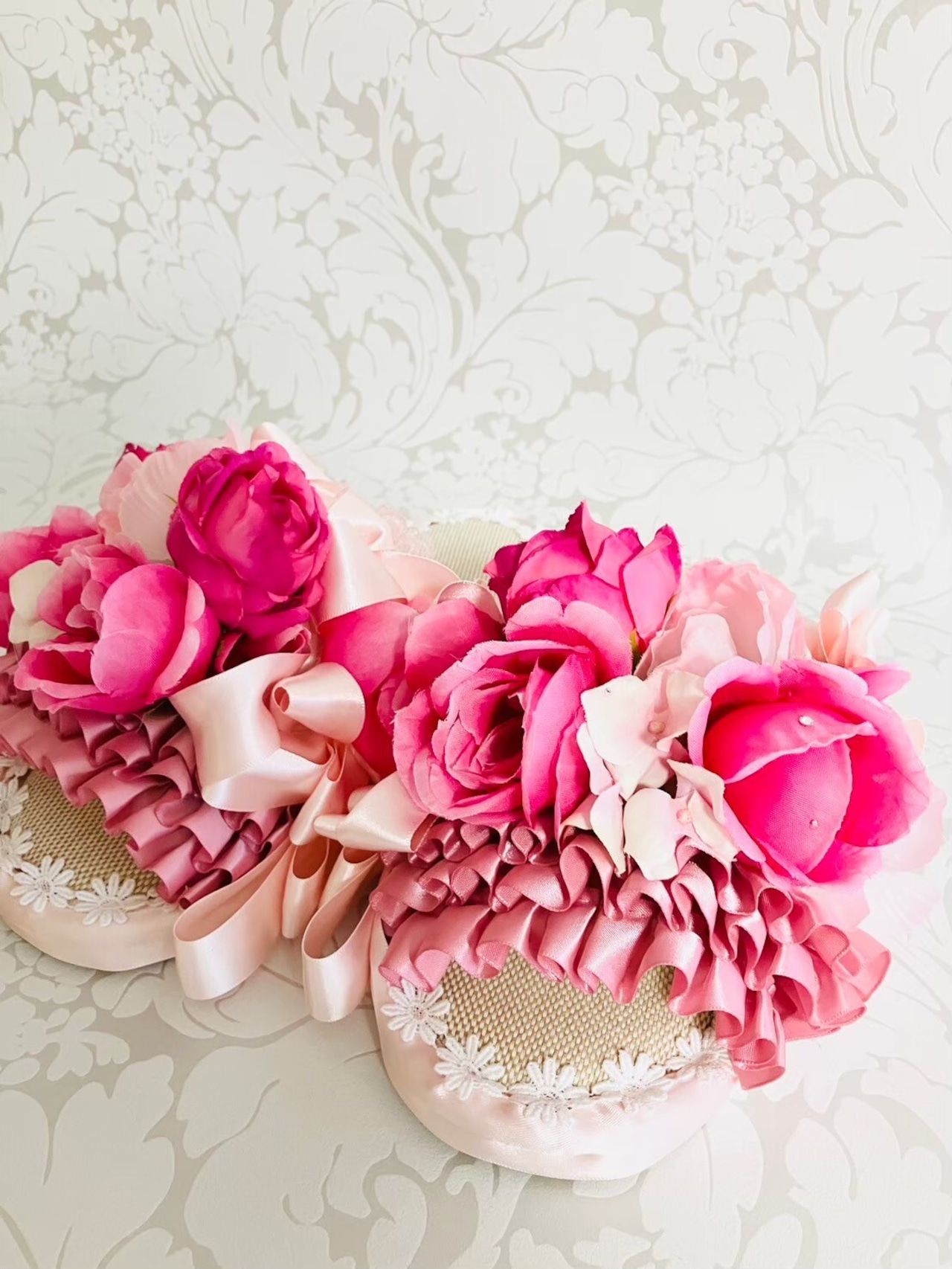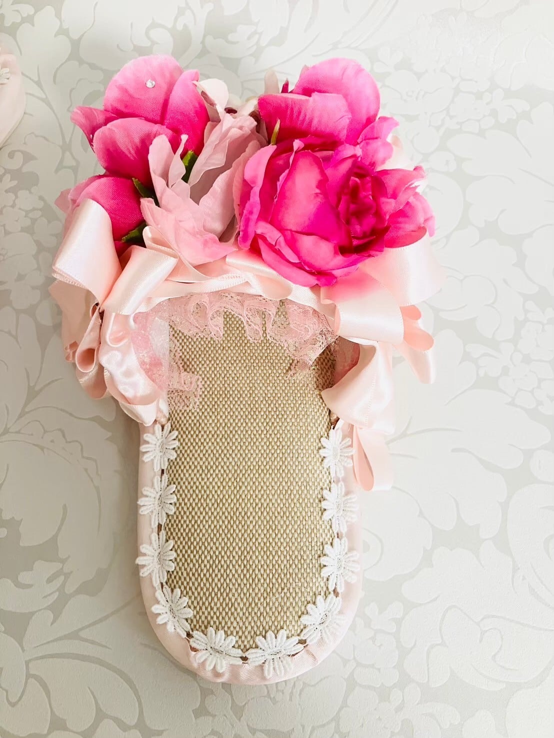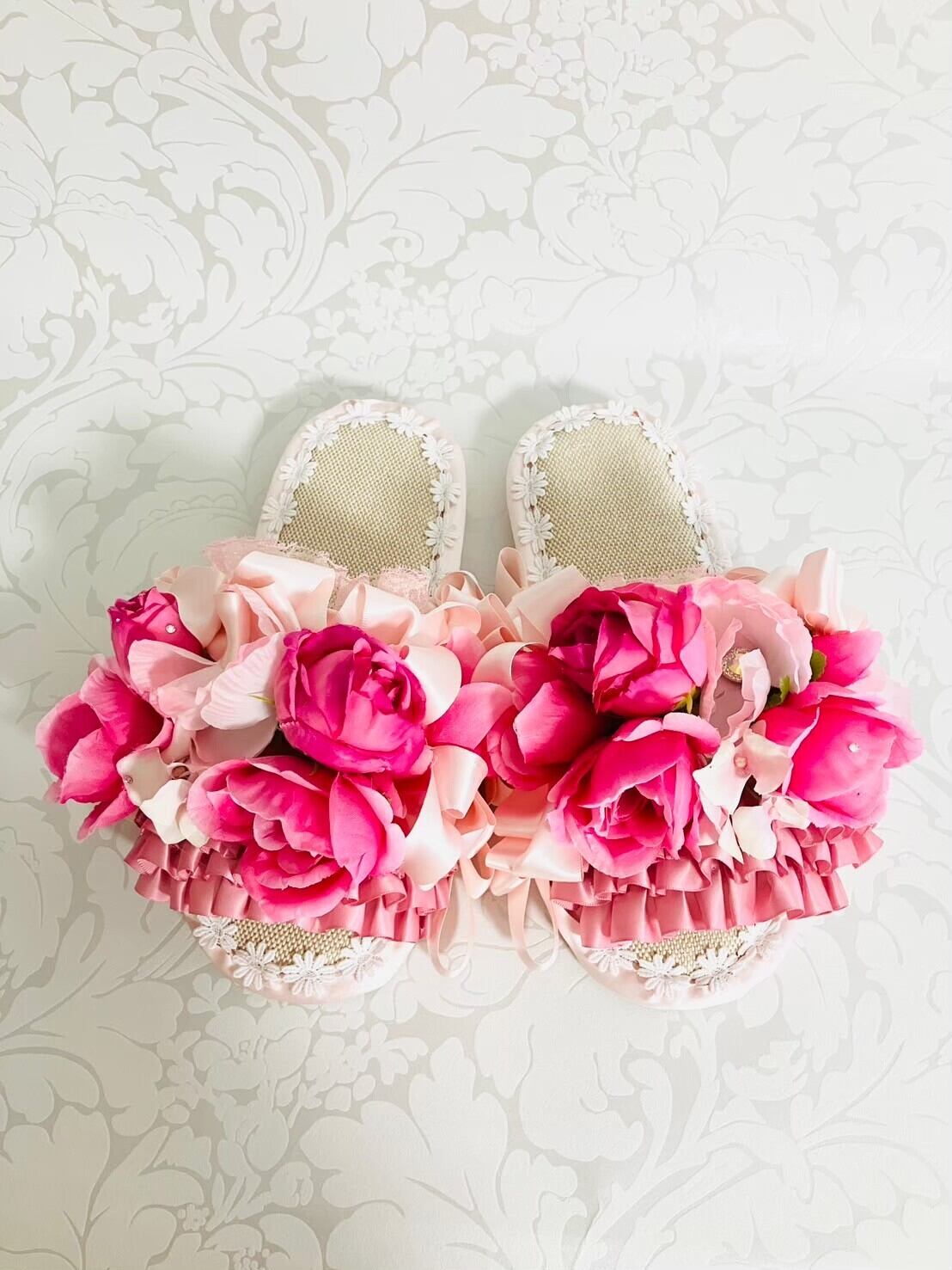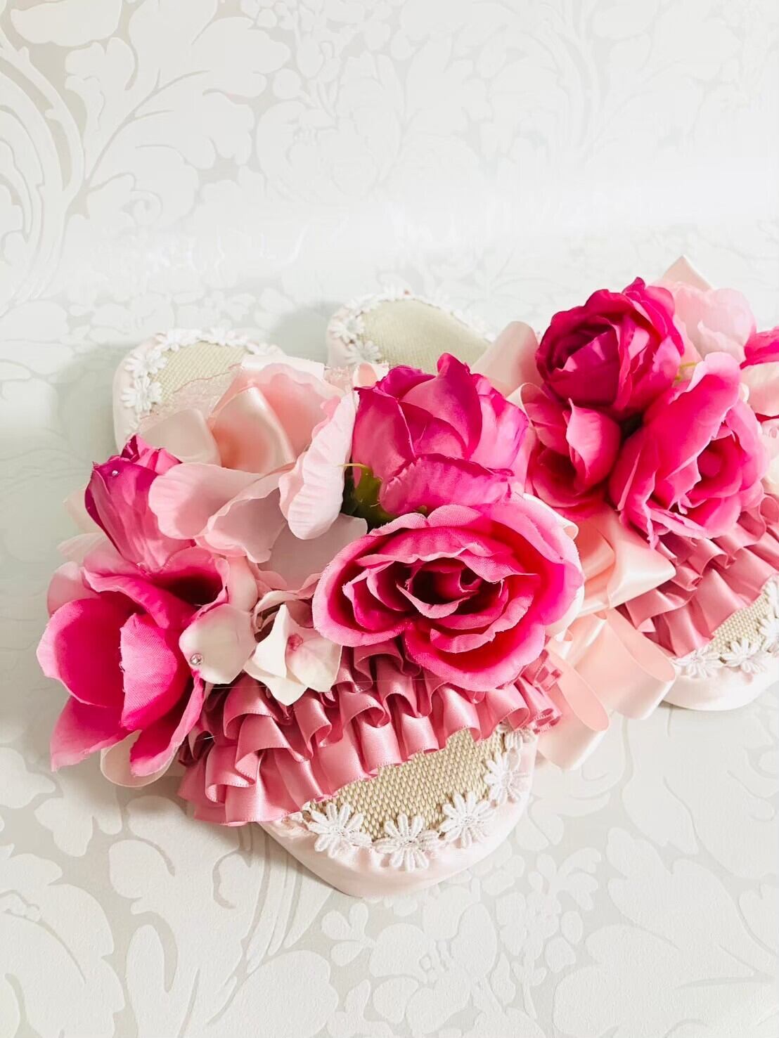 リボンとお花とレースをたっぷり使った楽屋スリッパです。