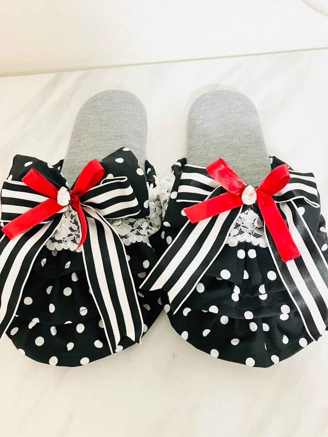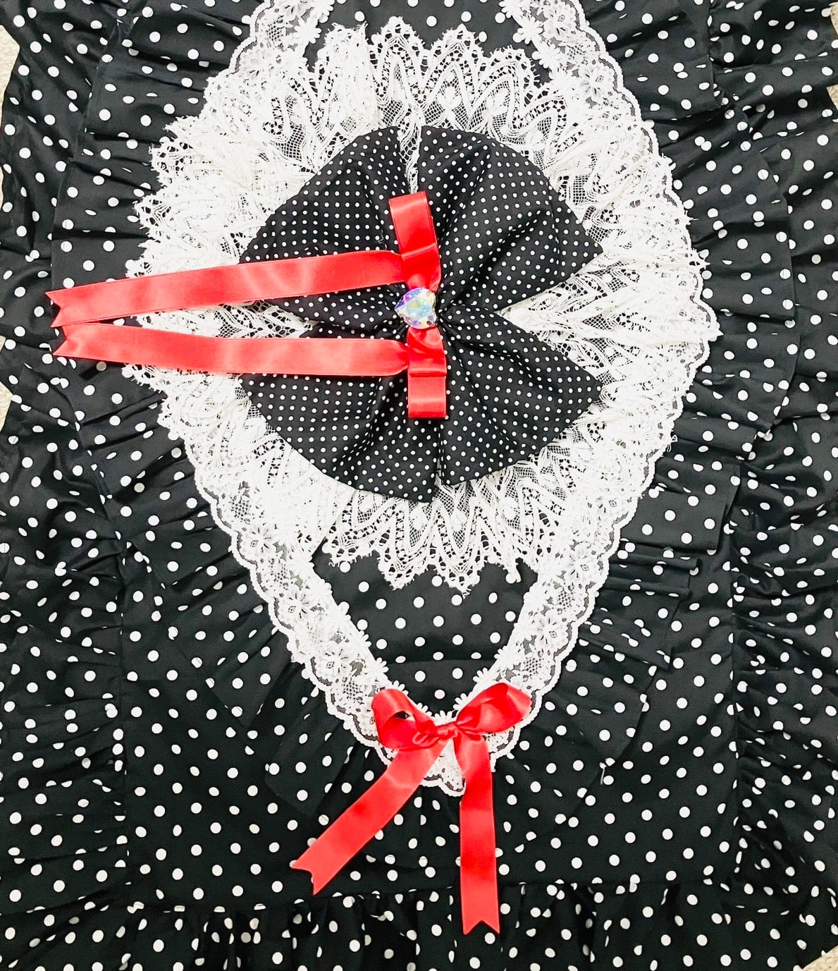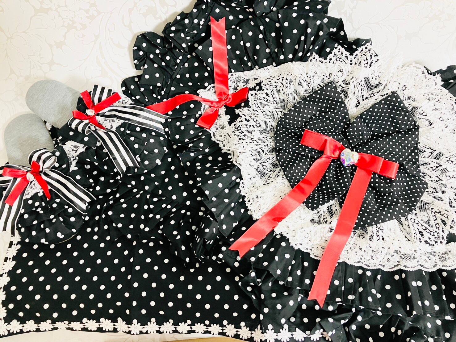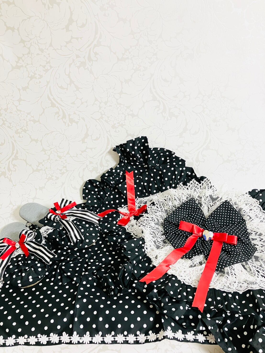 黒ドットの生地に赤リボンとハートのビジューをあしらいました。