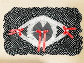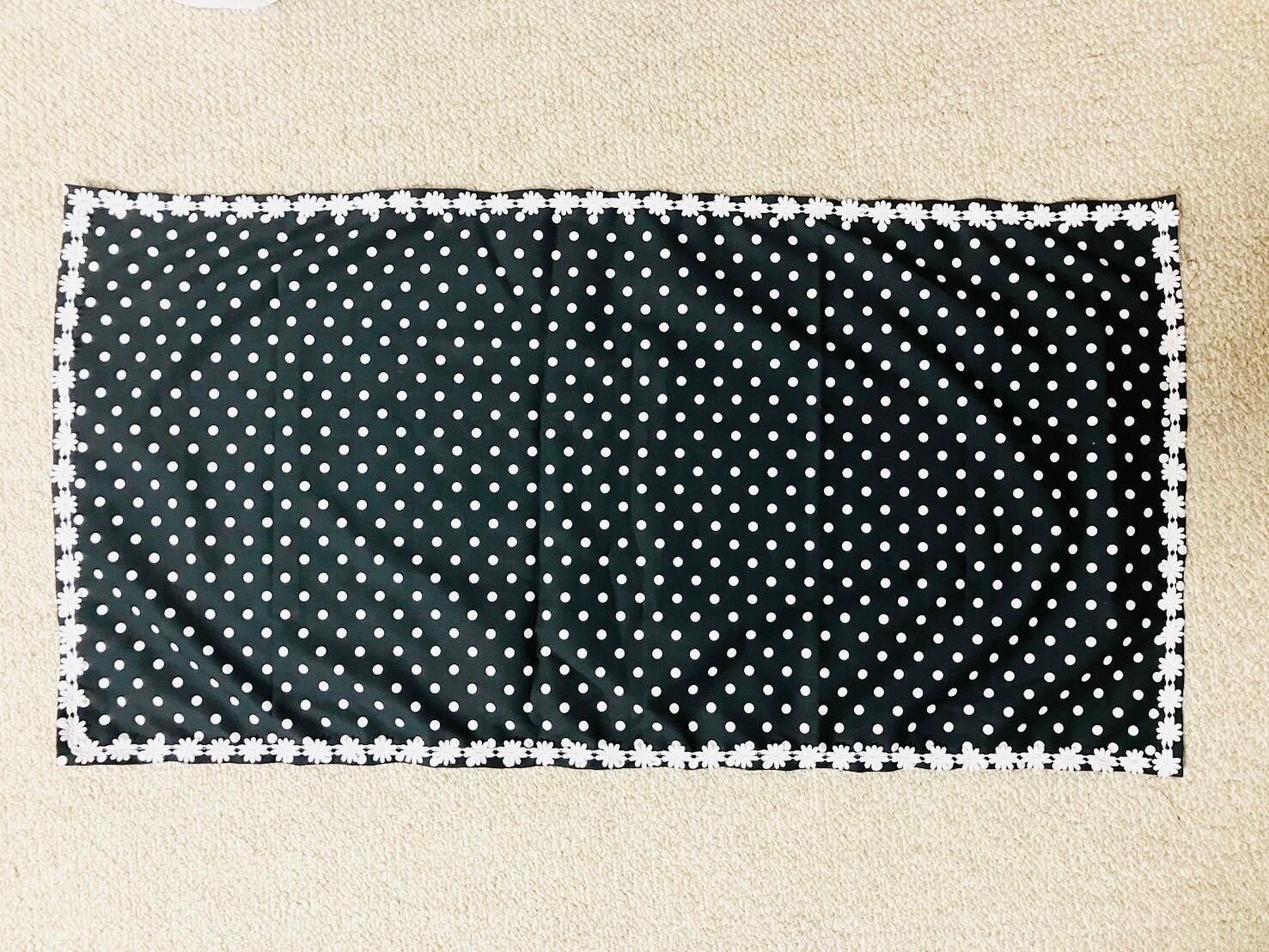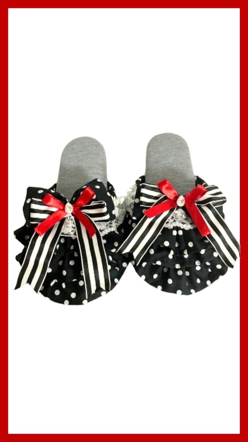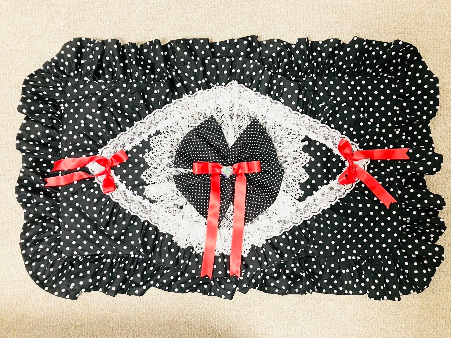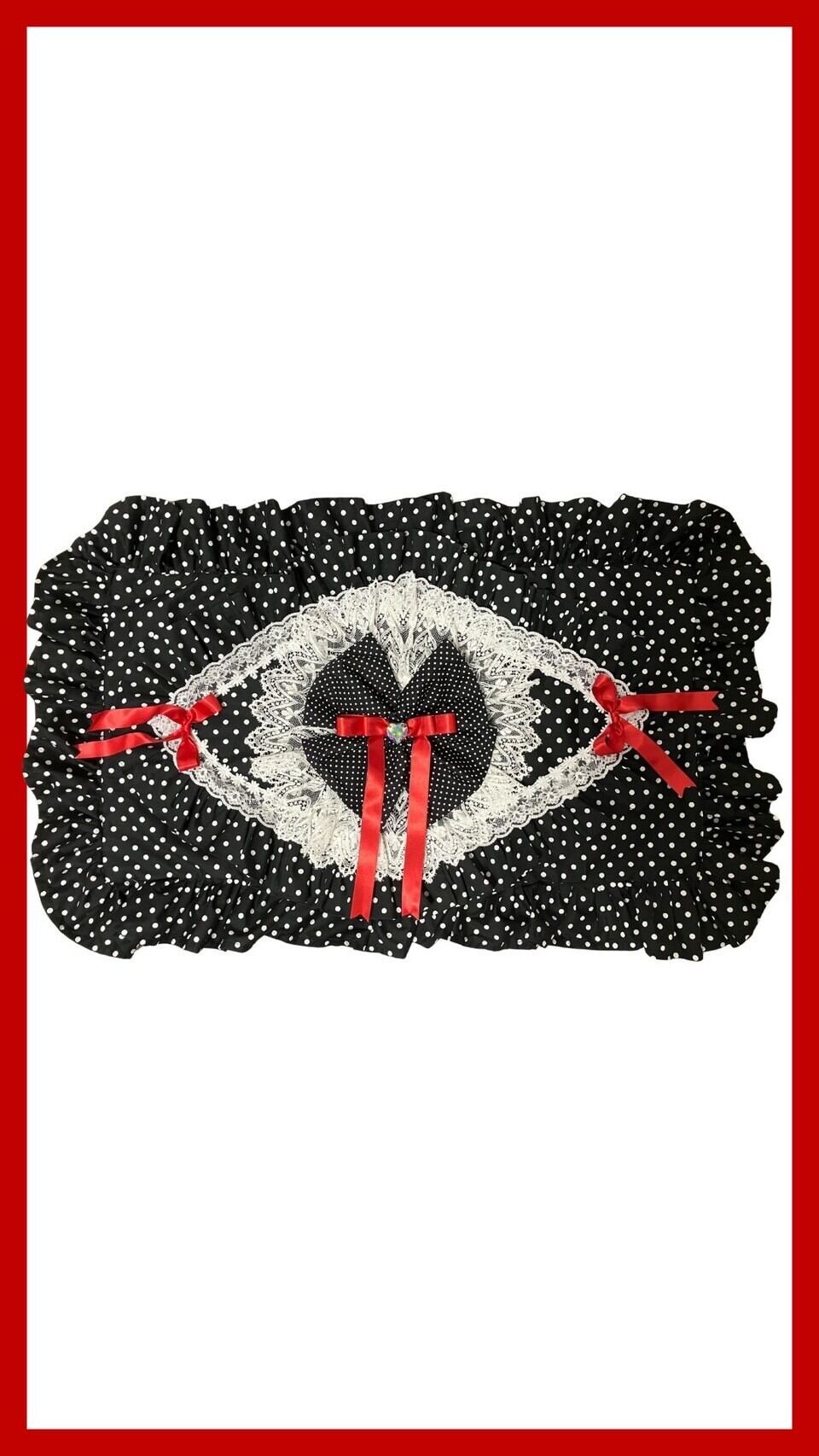 黒ドットの生地に赤リボンとハートのビジューをあしらいました。