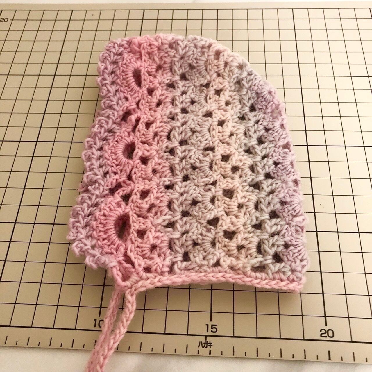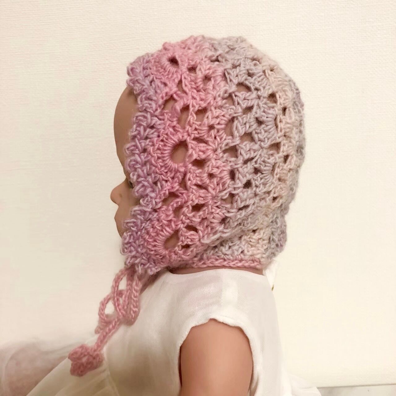 ニューボーンベビー~ベビー 手編み 帽子 ピンク×ラベンダー グラデーション レース編み