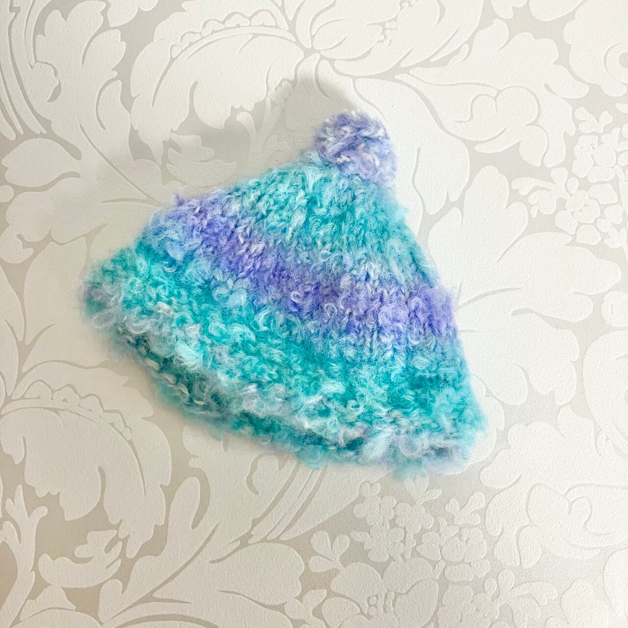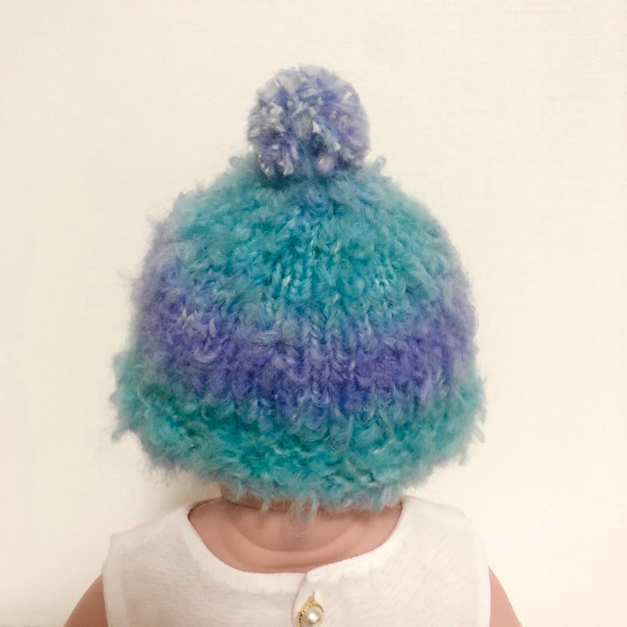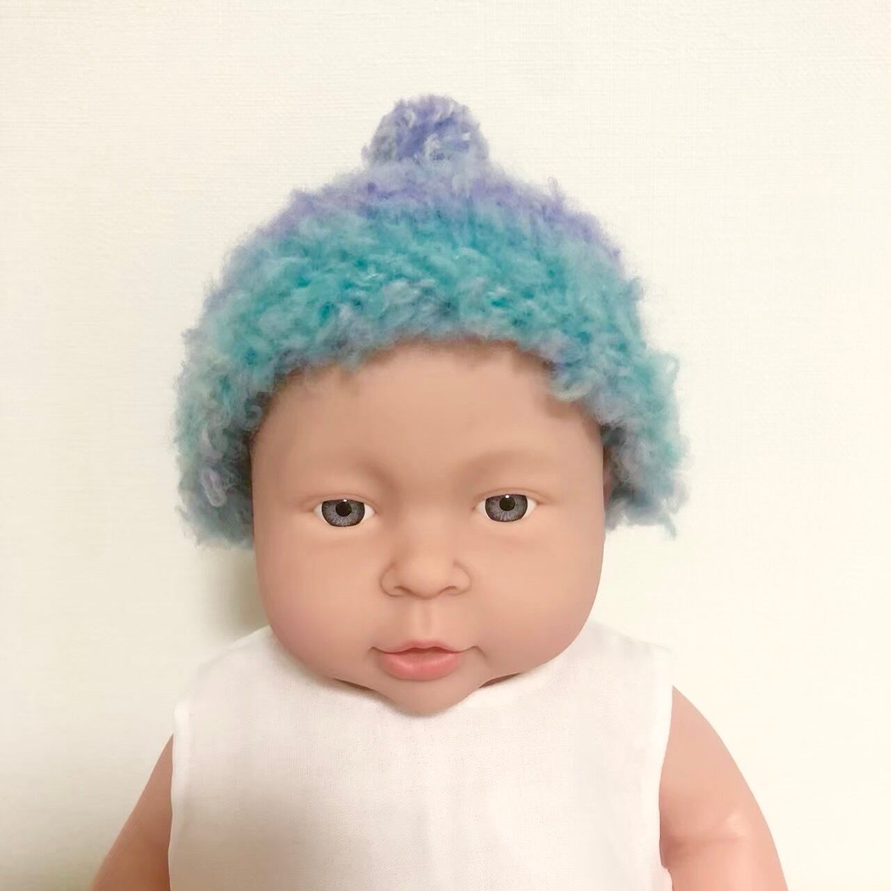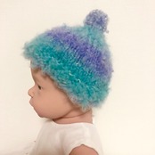 ニューボーンベビー~ベビー 手編み 帽子 ブルー×パープル ポンポン
