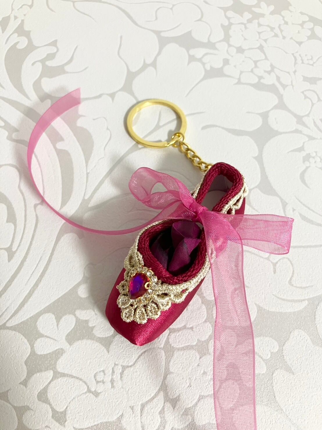 トウシューズキーホルダー レッド キトリ ビジュー レース リボン